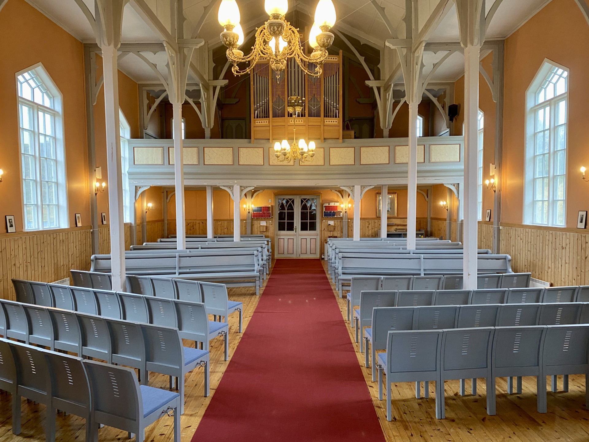 Kombinasjonen av benker og stoler tillater en vesentlig mer fleksibel bruk av kirkerommet. Med stoler framme i kirkeskipet kan det møbleres etter ulike behov. Her i forbindelse med en orgelkonsert hvor stolene er vendt mot kirkeorgel og organist.