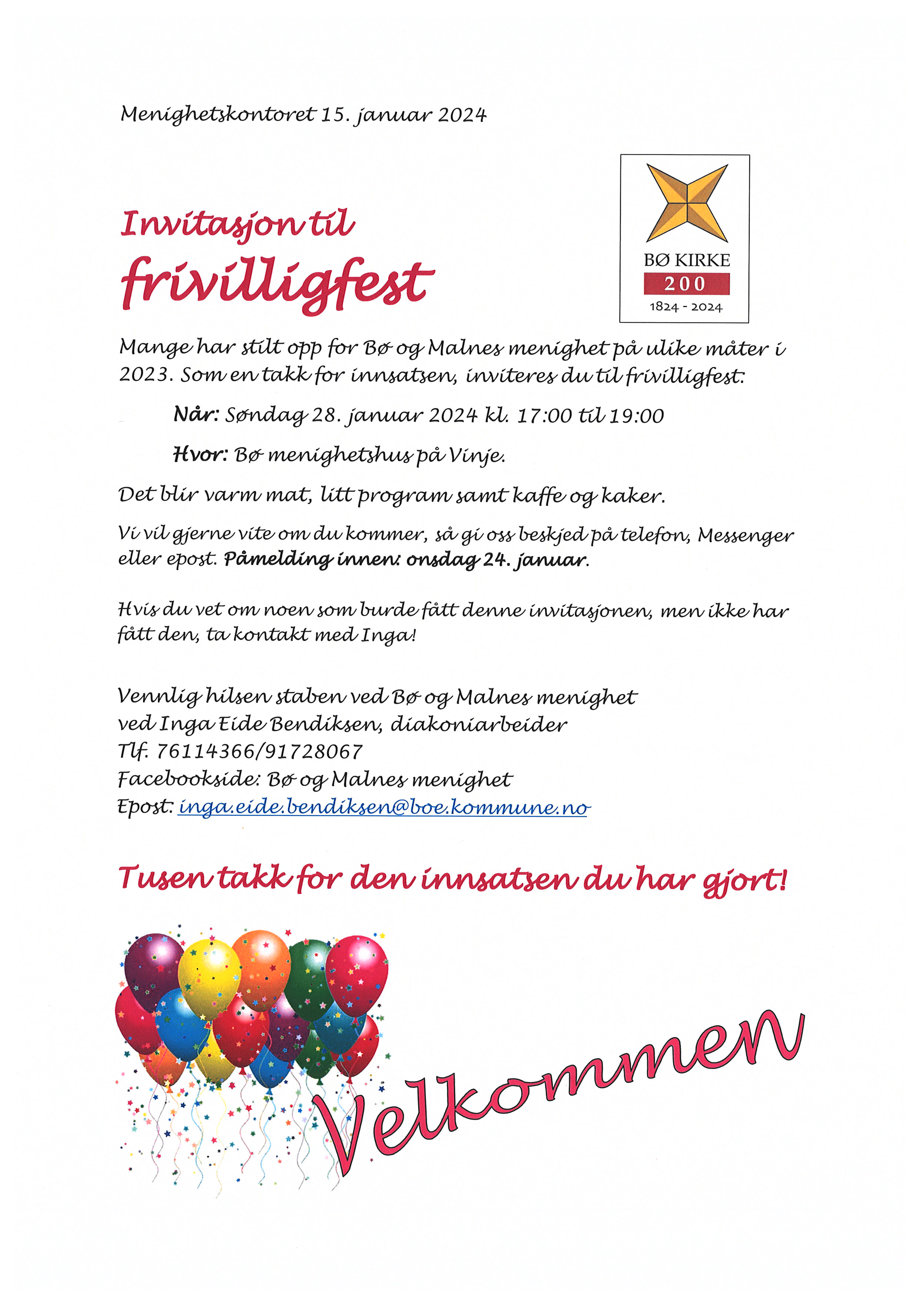 Vi feirer våre frivillige medarbeidere med fest på Bø menighetshus søndag 28. januar 2024.